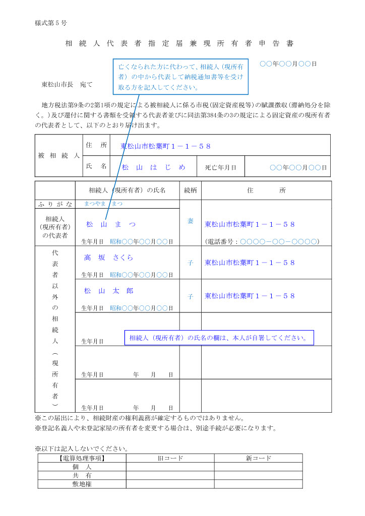 なお、届出書を提出した後、死亡した年の12月末日までに相続登記を行った場合は登記を優先します。(注意)相続人代表者指定届は市税の納税に限定したもので、法的に相続が確定するような書面ではありません。